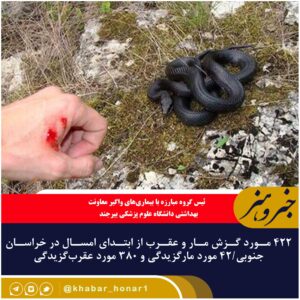 ۴۲۲ مورد گزش مار و عقرب از ابتدای امسال در خراسان جنوبی/۴۲ مورد مارگزیدگی و ۳۸۰ مورد عقربگزیدگی