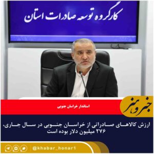 🔹استاندار خراسان جنوبی گفت: ارزش کالاهای صادراتی از خراسان جنوبی در سال جاری، ۲۷۶ میلیون دلار بوده است. سید محمدرضا هاشمی عصر با بیان این