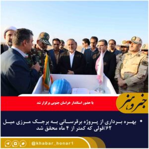 🔹مراسم بهره برداری از پروژه برقرسانی به برجک مرزی میل ۶۲ با حضور استاندار خراسان جنوبی برگزار شد. سید محمدرضا هاشمی، آذرماه و در اولین