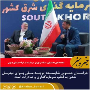 محمدصادق معتمدیان، استاندار تهران در بازدید از غرفه خراسان جنوبی در نمایشگاه بینالمللی اکسپو ۲۰۲۵، با تأکید بر ظرفیتهای بالای این استان در حوزههای مختلف،