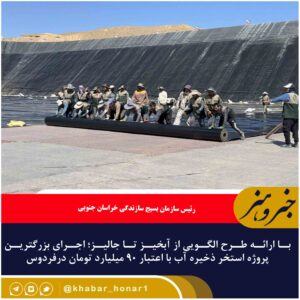 رئیس سازمان بسیج سازندگی خراسان جنوبی از اجرای بزرگترین پروژه استخر ذخیره آب در راستای ارائه طرح الگویی از آبخیز تا جالیز با اعتبار ۹۰