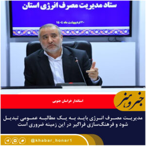 استاندار خراسان جنوبی گفت:مدیریت مصرف انرژی باید به یک مطالبه عمومی تبدیل شود و فرهنگسازی فراگیر در این زمینه ضروری است. سید محمدرضا هاشمی در