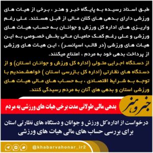 طبق اسناد رسیده به پایگاه خبر و هنر ، برخی از هیات های ورزشی دارای بدهی های کلان مالی از قبل هستند. علی رغم واریزی