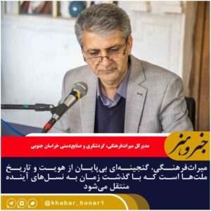 مدیرکل میراثفرهنگی، گردشگری و صنایعدستی خراسان جنوبی گفت میراثفرهنگی، گنجینهای بیپایان از هویت و تاریخ ملتها است که با گذشت زمان به نسلهای آینده منتقل