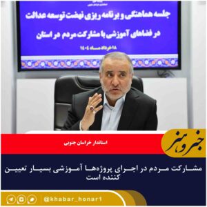 🔹استاندار خراسان جنوبی گفت: مشارکت مردم در اجرای پروژهها بسیار تعیینکننده است. سید محمدرضا هاشمی در جلسه هماهنگی و برنامهریزی نهضت توسعه عدالت آموزشی با