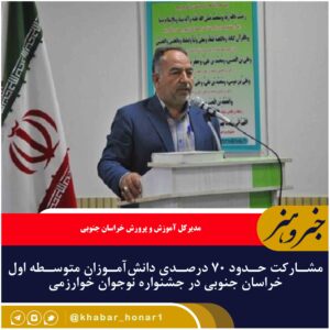 مدیرکل آموزش و پرورش خراسان جنوبی، از مشارکت گسترده و ۷۰ درصدی دانشآموزان خراسان جنوبی در یازدهمین دوره جشنواره نوجوان خوارزمی خبر داد. مهدی مرتضوی