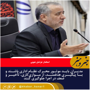 🔹استاندار خراسان جنوبی گفت: مدیران در پیشبرد اهداف تحولگرا نقش کلیدی دارند. سید محمدرضا هاشمی، در جلسه شورای راهبری و تحول اداری استان با تأکید
