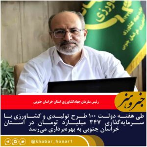 رئیس سازمان جهادکشاورزی استان خراسان جنوبی گفت: طی هفته دولت ۱۰۰ طرح تولیدی و کشاورزی با سرمایهگذاری ۳۴۷ میلیارد تومان در استان خراسان جنوبی به