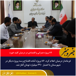 به گزارش خبر و هنر، فرماندار شهرستان درمیان از افتتاح و کلنگزنی ۸۹ پروژه عمرانی و اقتصادی با اعتباری بالغ بر ۳۹۰ میلیارد تومان در