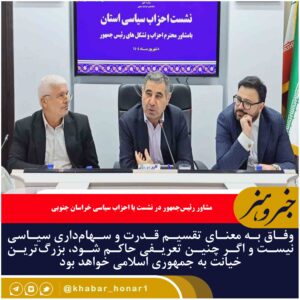 مشاور رئیسجمهور در نشست با احزاب سیاسی خراسان جنوبی تأکید کرد: وفاق به معنای تقسیم قدرت و سهامداری سیاسی نیست و اگر چنین تعریفی حاکم