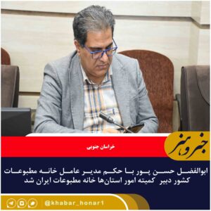 ابوالفضل حسن پور مدیر مسول خبر و هنر و عضو هیات مدیره خانه مطبوعات خراسان جنوبی با حکم مدیر عامل خانه مطبوعات کشور دبیر کمیته