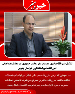 - تشکیل دبیرخانه پیگیری مصوبات سفر ریاست جمهوری در معاونت هماهنگی امور اقتصادی استانداری خراسان جنوبی