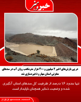 - در پی بارشهای اخیر ۲ میلیون و ۴۰۰ هزار مترمکعب روان آب در سدهای مخزنی استان مهار و ذخیرهسازی شد