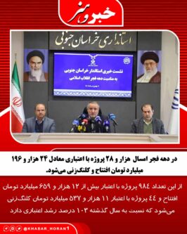 استاندار خراسان جنوبی گفت: هزار و ۲۸ پروژه با اعتبار ۲۴ هزار و ۱۹۶ میلیارد تومان در دهه فجر امسال در استان به بهرهبرداری میرسد