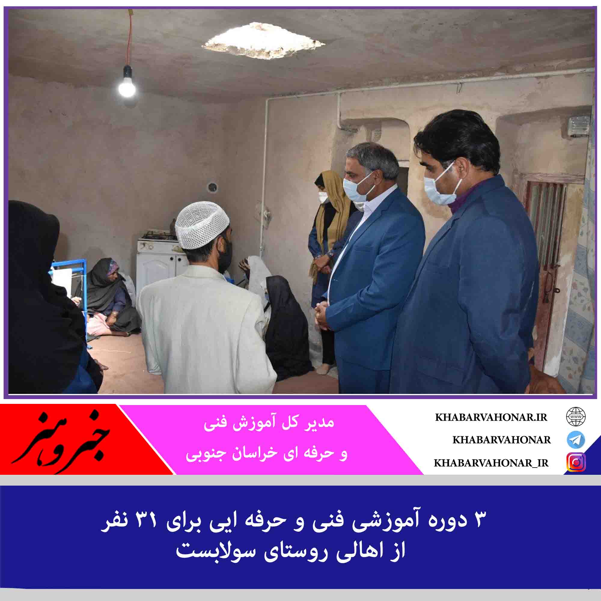 مدیر کل آموزش فنی و حرفه ای خراسان جنوبی از دوره های آموزشی روستای سولابست بازدید نمود و جهت آشنایی با روستا برای برنامه ریزی دوره های آتی ضمن بازدید میدانی از روستا و گفتگو با مردم مواردی را جهت اجرای دوره های متناسب با نیاز مردم جهت اجرا به شهرستان ابلاغ نمود.