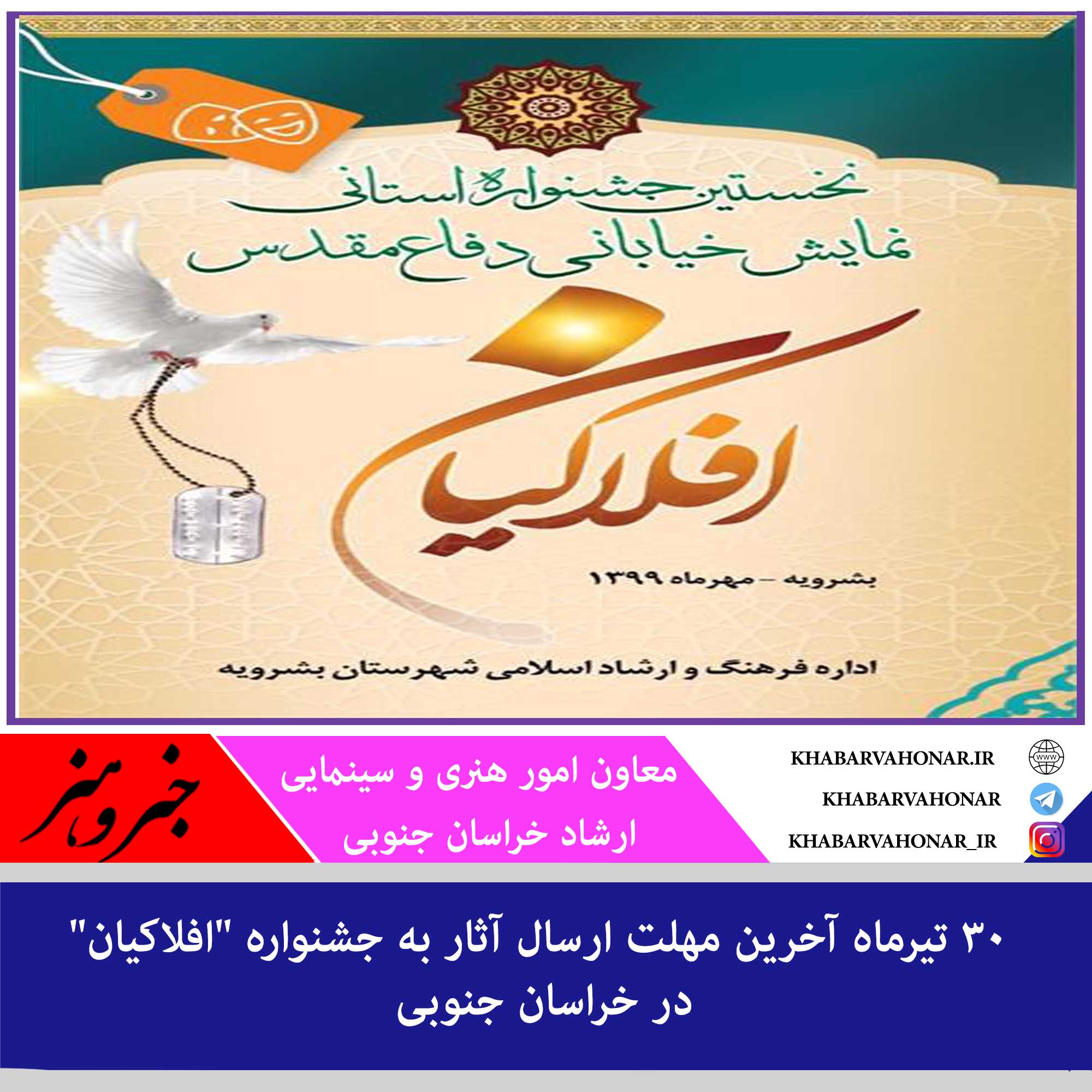 معاون امور هنری و سینمایی اداره کل فرهنگ و ارشاد اسلامی خراسان جنوبی گفت: آخرین مهلت ارسال آثار به نخستین جشنواره استانی نمایش خیابانی دفاع مقدس با عنوان “افلاکیان” ۳۰ تیرماه ۹۹ اعلام شد.سید علی زمزم با بیان این خبر، عنوان کرد: این جشنواره به میزبانی شهرستان بشرویه، ۲ تا ۴ مهرماه همزمان با هفته دفاع مقدس برگزار می شود. به گفته وی هدف از برگزاری جشنواره “افلاکیان” ، تکریم ایثار و یاد و خاطره حماسه آفرینان و مدافعان سرافراز میهن اسلامی و به خصوص شهدای والامقام دفاع مقدس و به پاس رشادت های سرداران رشید اسلام و مدافعین حرم و به منظور دستیابی به تجربه های نوین در حمایت از خلاقیت ها و استعدادهای هنری استان و لزوم ایجاد شور و نشاط در جامعه و آشنایی نسل جوان با فرهنگ ایثار می باشد.