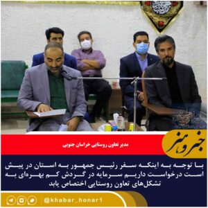 مدیر تعاون روستایی خراسان‌ جنوبی با تأکید بر اینکه دولت باید به تعاون روستایی کمک کند و حمایت‌هایش را به این سمت سوق دهد، افزود: با توجه به اینکه سفر رئیس جمهور به استان در پیش است درخواست داریم سرمایه در گردش کم بهره ای به تشکل‌های تعاون روستایی اختصاص یابد تا از دامنه خدمات دهی به مردم عقب نمانند.